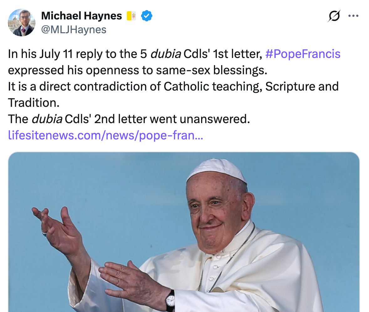 Notable prelates – Cdls. Müller and Zen and Sarah, Abp. Viganò, Bp. Schneider – all penned their rejection of the document’s proposal for same-sex blessings, many doing so repeatedly. Sarah went so far as to state that Fiducia Supplicans proposes a “heresy that gravely undermines the Church, the Body of Christ, because it is contrary to the Catholic faith and tradition.”