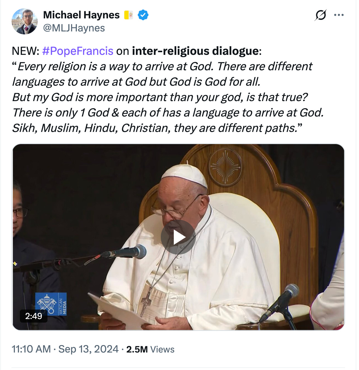 “every religion is a way to arrive at God. There are different languages to arrive at God, but God is God for all. And how is God God for all? We are all sons and daughters of God. But my god is more important than your god, is that true? There is only one God and each of us has a language to arrive at God. Sikh, Muslim, Hindu, Christian, they are different paths.”